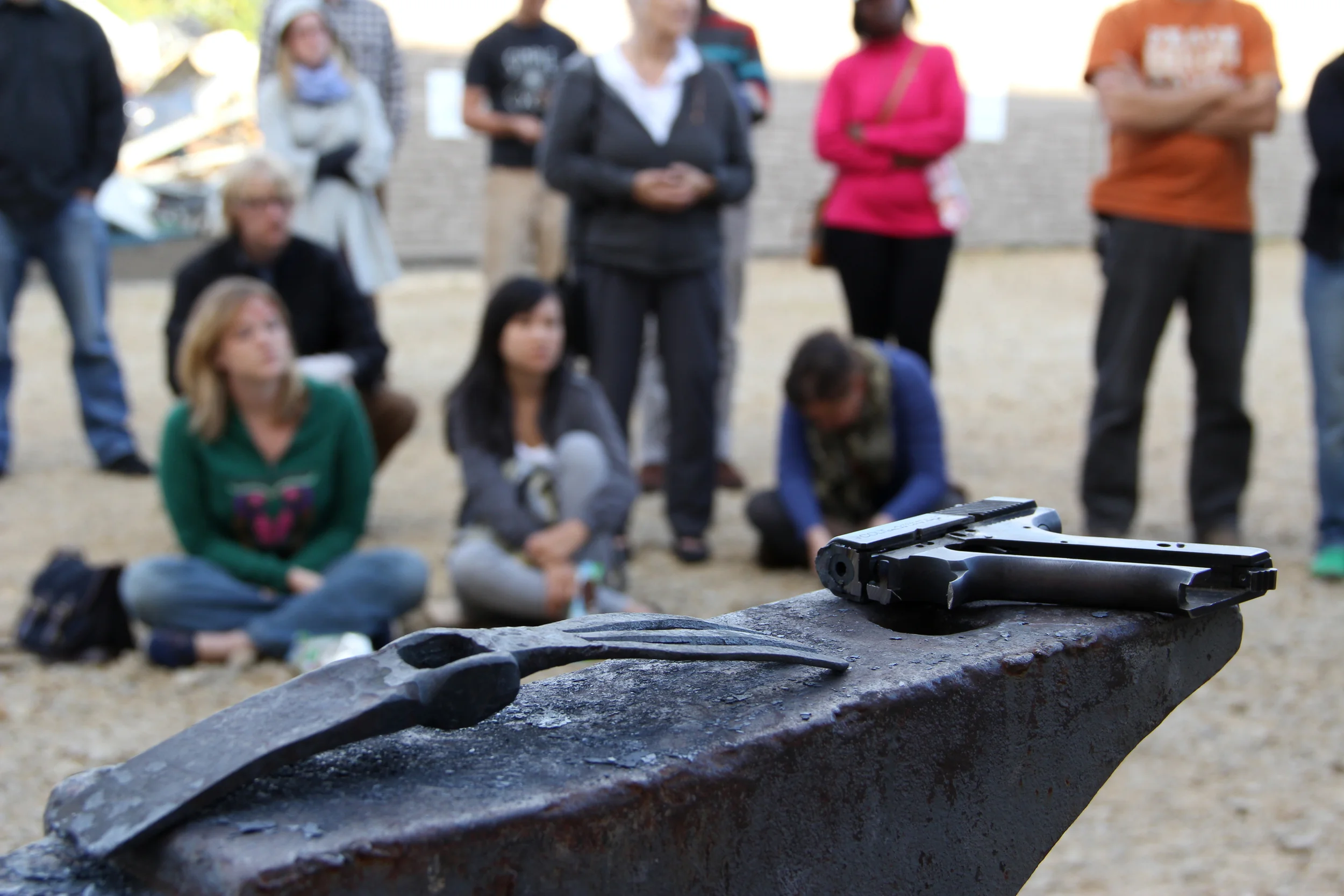 “PeaceMaker” is an hour-long ceremony centered in the Christian faith in which a gun is forged into a garden tool while songs, art, stories, and scripture are shared.